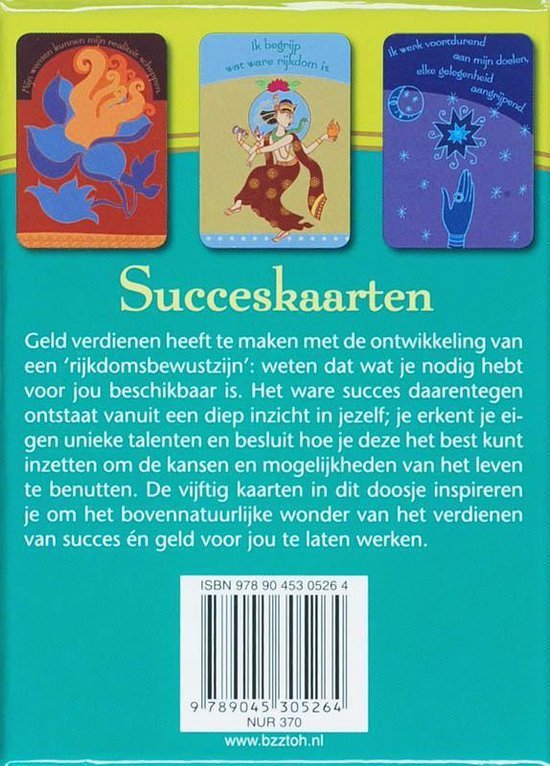 - Extra informatie: Samenvatting Succeskaarten Geld verdienen heeft te maken met de ontwikkeling van een 'rijkdomsbewustzijn': weten dat wat je nodig hebt voor jou beschikbaar is. Het ware succes daarentegen ontstaat vanuit een diep inzicht in jezelf; je erkent je eigen unieke talenten en besluit hoe je deze het best kunt inzetten om de kansen en mogelijkheden van het leven te benutten. De vijftig kaarten in dit doosje inspireren je om het bovennatuurlijke wonder van het verdienen van succes geld voor jou te laten werken.