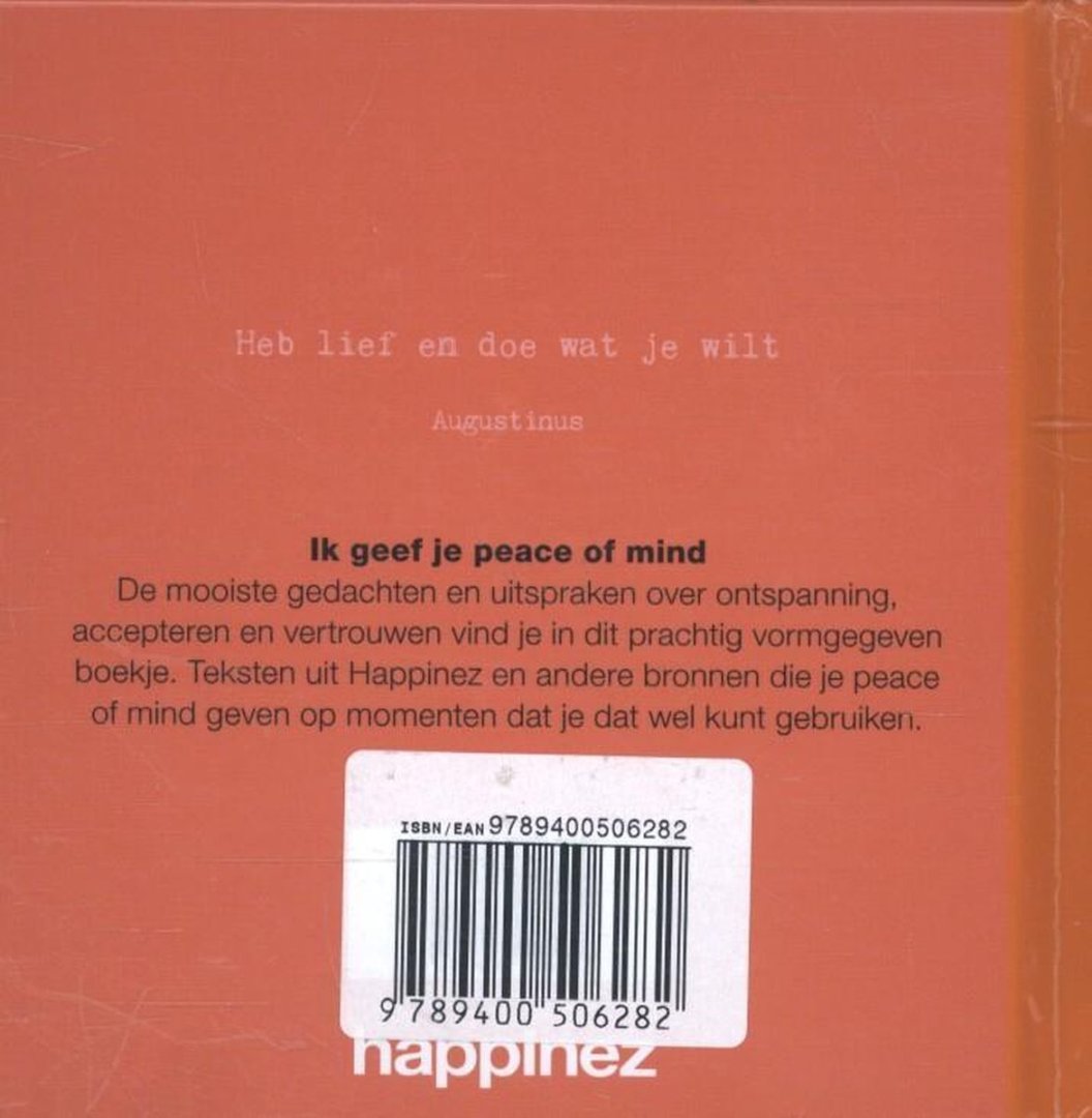 - Extra informatie: Samenvatting De mooiste gedachten en uitspraken over ontspanning, accepteren en vertrouwen vind je in dit prachtig vormgegeven boekje. Teksten uit Happinez en andere bronnen die je peace of mind geven op momenten dat je dat wel kunt gebruiken. Productspecificaties